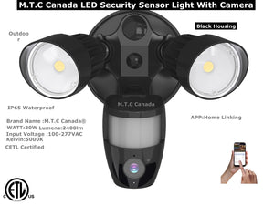 M.T.C Canada® LED Security Sensor Light with Camera Motion-Activated HD Security Cam Two-Way Talk 20W 2400lm 5000K Input Voltage 100-277VAC CETL Certified Black Housing