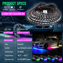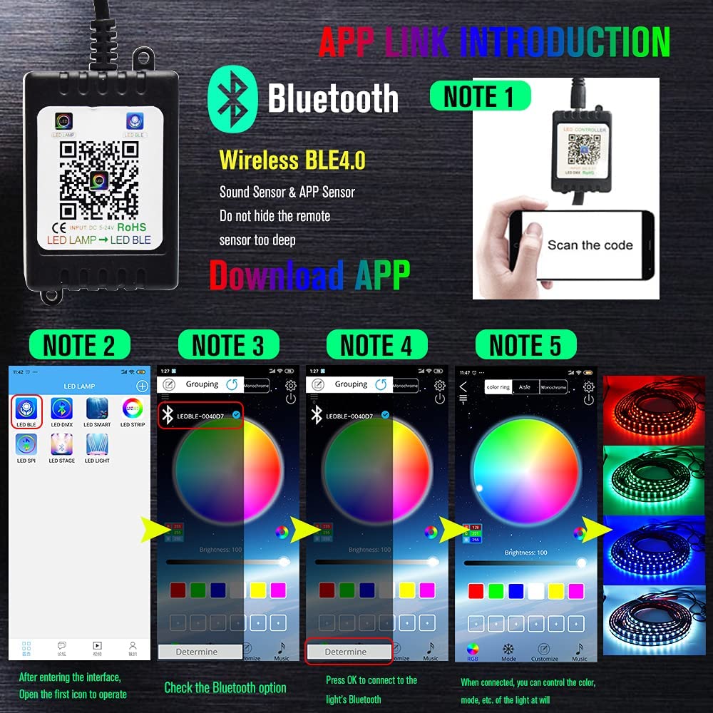 - Car Underglow Lights Bluetooth:Scan QR code on control box,download APP,turn on Bluetooth,connect to LED strip and control it.App suitable for IOS or Android system.Specific operation is showned as picture 5,everything controlled by your phone,very convenient and easy operation.