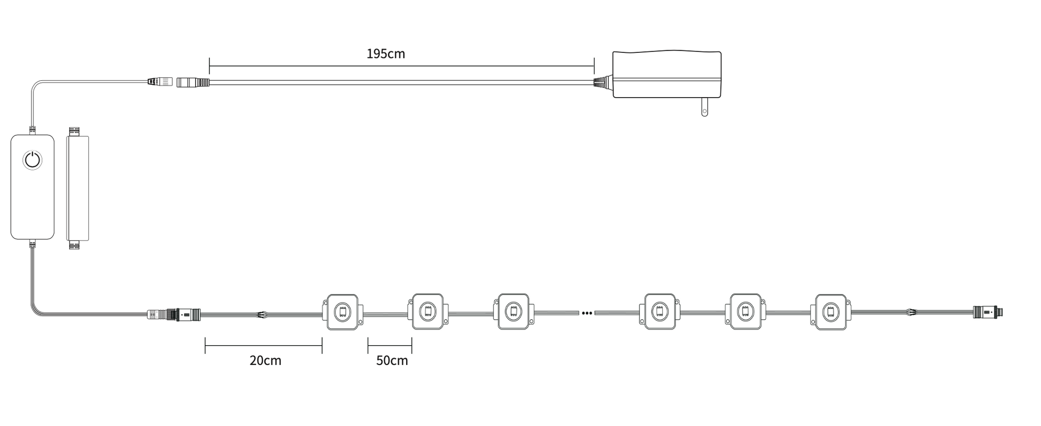 Product Specifications :Default input voltage: 100-240VC Power CeTL , output voltage: 24VDC ,10 lights per string, each string is 5 meters long, total of 6 strings. Each light bead can be independently controlled.